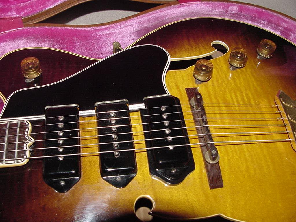 pickups, three volume controls, one master tone control on cutaway bout, trapeze